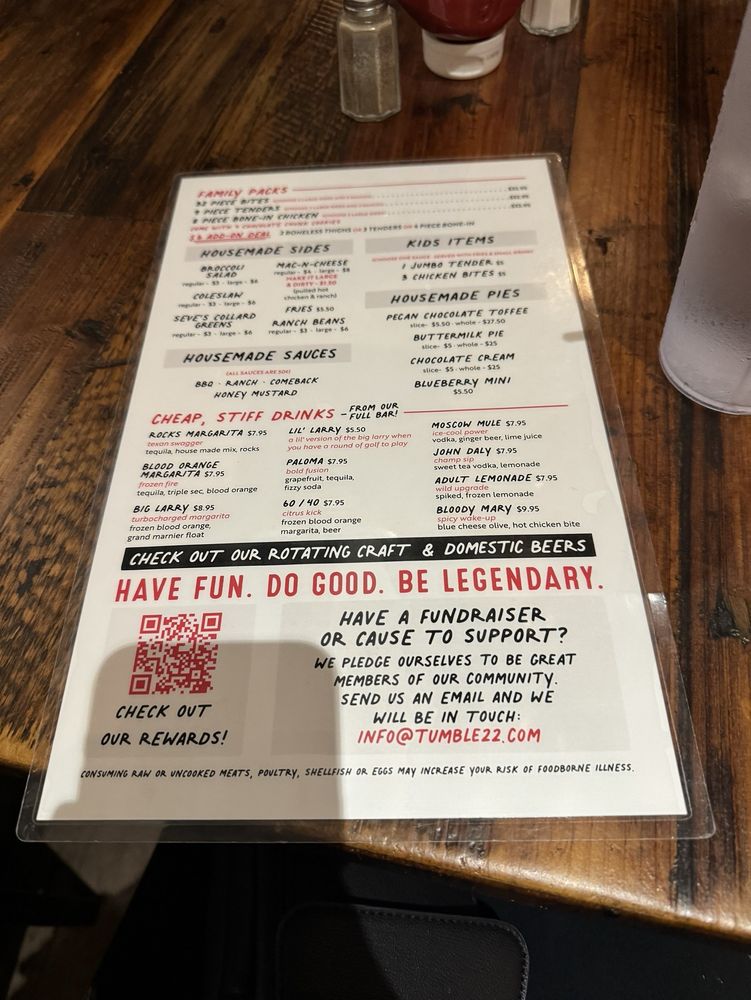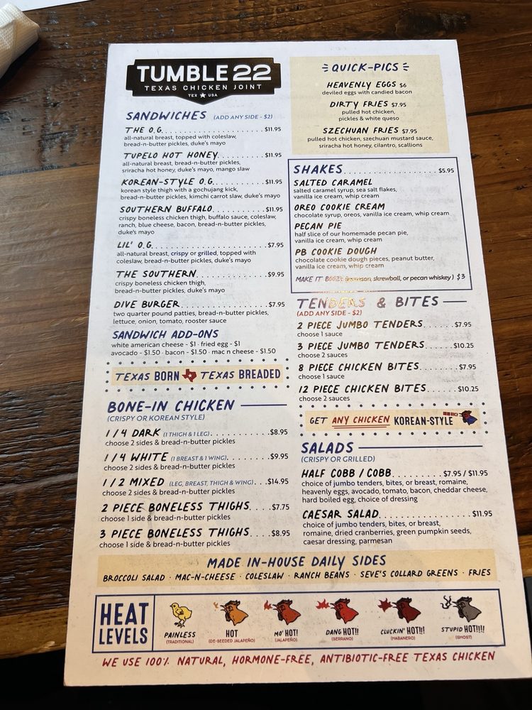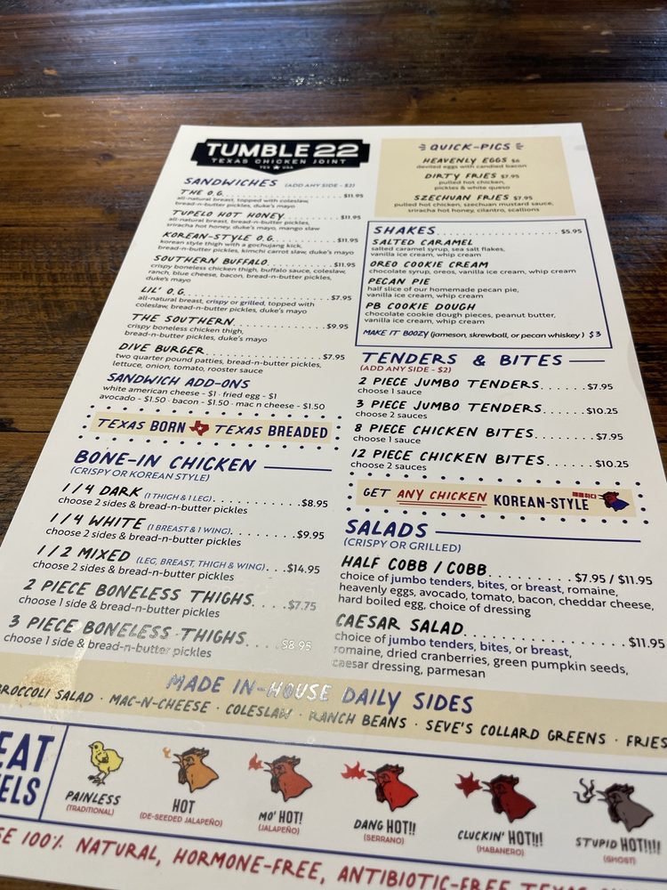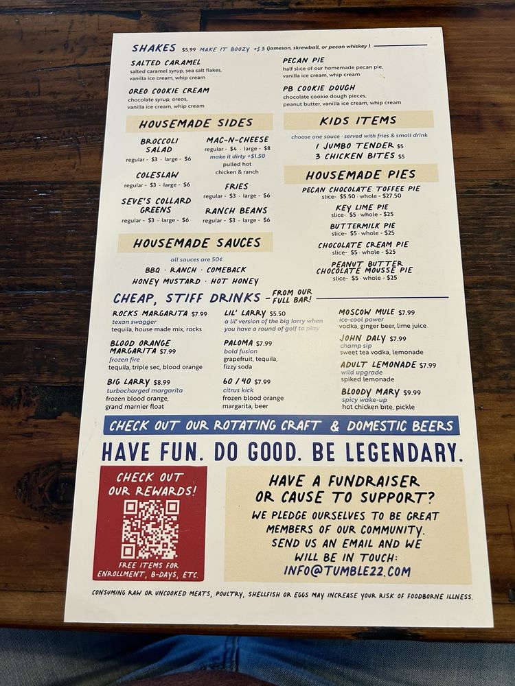 Introducing the menu at Tumble 22, a Chicken Shop in Houston, TX, offers a variety of bone-in and boneless chicken options cooked to perfection. The menu includes 1/4 Dark Leg and Thigh, 1/4 White Wing and Breast, 1/2 Mixed Chicken, Boneless Thighs, Drumsticks, Wings, and Breasts, all with customizable heat levels and delicious sides. Family Packs and specials like the 4th of July Special and Memorial Weekend Picnic offer great value for groups. Don't miss out on their housemade pies including Buttermilk, Chocolate, Texas Pecan, Key Lime, and Peanut Butter. Customers rave about the flavorful Southern comfort food, with highlights like perfectly seasoned collard greens and creamy mac and cheese. Friendly service and a cozy atmosphere make Tumble 22 a must-visit spot for comforting and delicious meals.
