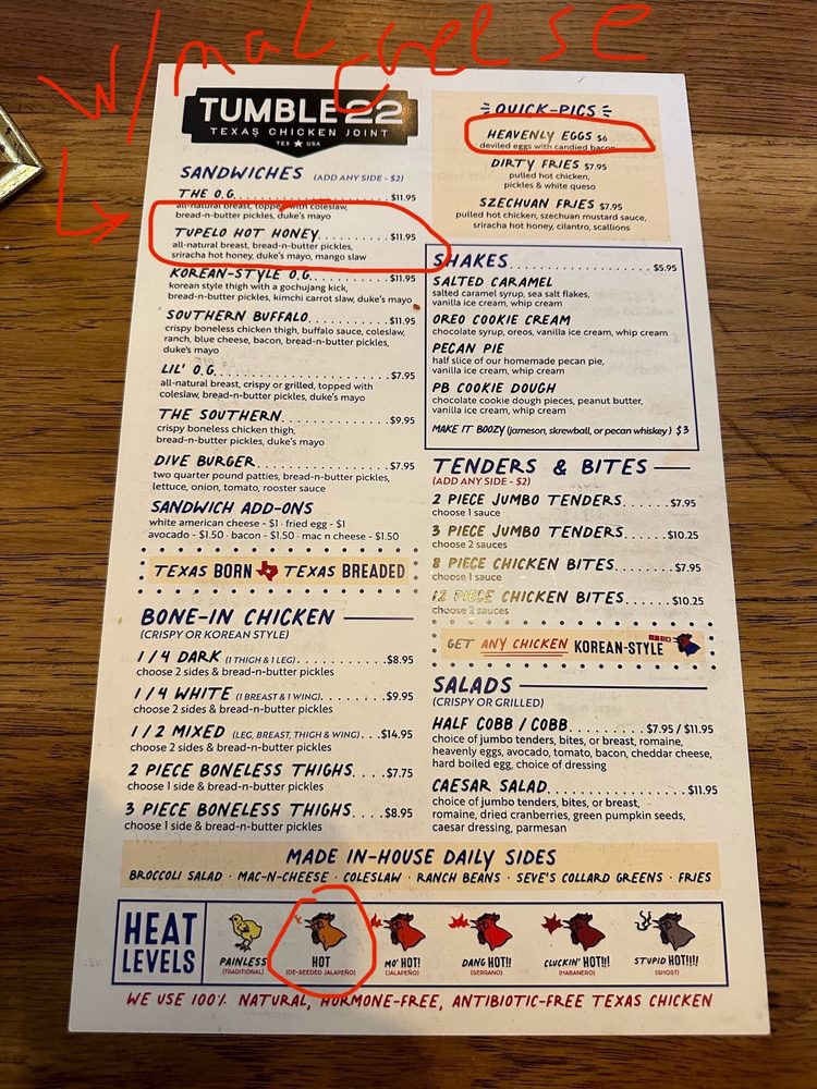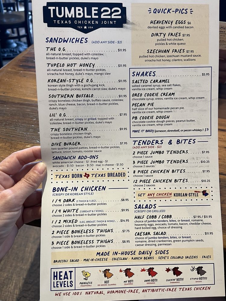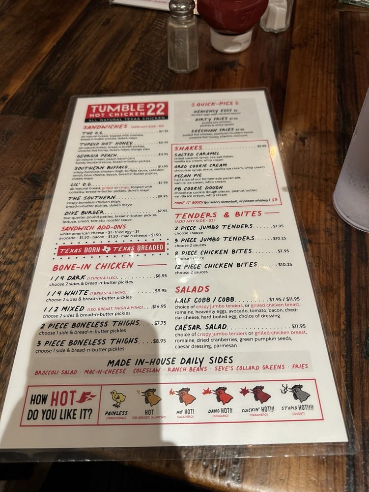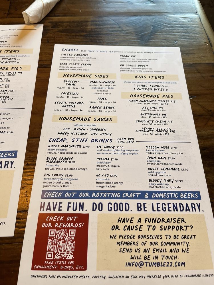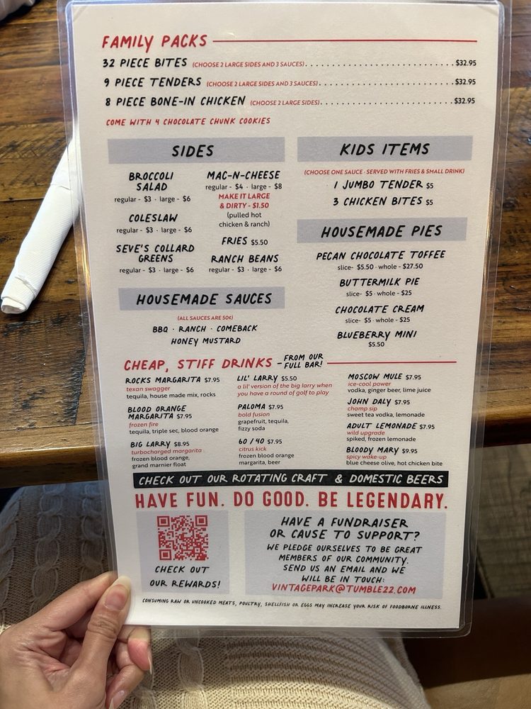 Introducing the menu at Tumble 22, a Chicken Shop in Houston, TX, offers a variety of bone-in and boneless chicken options cooked to perfection. The menu includes 1/4 Dark Leg and Thigh, 1/4 White Wing and Breast, 1/2 Mixed Chicken, Boneless Thighs, Drumsticks, Wings, and Breasts, all with customizable heat levels and delicious sides. Family Packs and specials like the 4th of July Special and Memorial Weekend Picnic offer great value for groups. Don't miss out on their housemade pies including Buttermilk, Chocolate, Texas Pecan, Key Lime, and Peanut Butter. Customers rave about the flavorful Southern comfort food, with highlights like perfectly seasoned collard greens and creamy mac and cheese. Friendly service and a cozy atmosphere make Tumble 22 a must-visit spot for comforting and delicious meals.